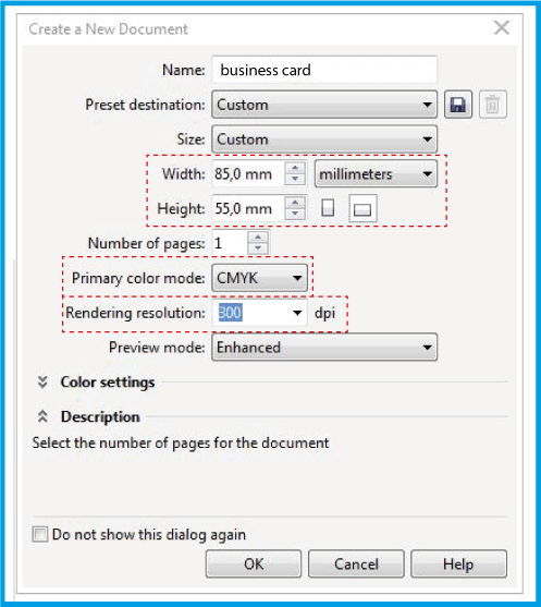 1.2 .在此窗口中,定义文档的名称和尺寸。选择CMYK字段原色模式,并在渲染分辨率中输入300 dpi.